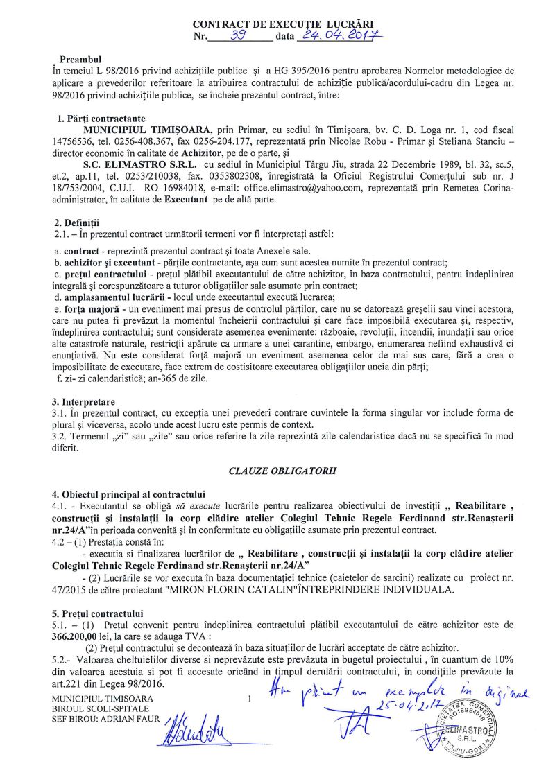 Suma estimată era de 549.875 de lei, cu tot cu TVA, adică puțin peste 120.000 euro. Au depus oferte trei firme, iar pe 9 mai 2017 a fost desemnat câștigătorul, pe criteriul celui mai mic preț oferit. Licitația a fost câștigată de SC Elimastro SRL, care va face lucrarea la un preț de 435.778 de lei, cu tot cu TVA. “În baza contractului care se va încheia vor fi executate lucrări de construcții și refacere atât asupra clădirii atelier-școală din incinta Colegiului Tehnic “Regele Ferdinand I”, str. Renașterii, nr.24/A, cât și asupra tuturor instalațiilor aferente acestei clădiri. Lucrările vor fi realizate în conformitate cu cerințele documentației tehnice și vor fi realizate în maximum 4 luni de la data emiterii ordinului de începere a lucrărilor”, spun reprezentanții Primăriei Timișoara, citați de presa locală.