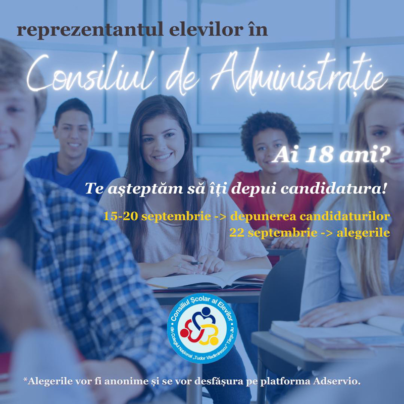 Consiliul Școlar din cadrul Colegiului Național ,,Tudor Vladimirescu” Târgu-Jiu a organizat în această perioada sesiunea de înscrieri pentru elevii care își vor reprezenta colegii în cadrul Consiliului de Administrație al școlii. Candidaturile în acest sens s-au depus până pe 20 septembrie, urmând ca astăzi să fie desemnat elevul ales. Candidații care s-au înscris în această cursă au avut de îndeplinit următoarele condiții: să aibă vârsta de 18 ani împliniți, să nu aibă rude sau afini până la gradul IV inclusiv desemnați ca membri în același consiliu de administrație, să nu fi primit sancțiuni disciplinare în ultimii trei ani.