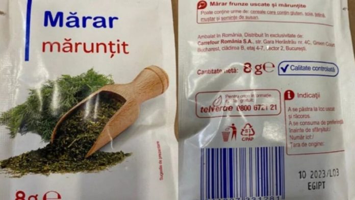 Autoritatea Națională Sanitar-Veterinară a transmis o alertă ca urmare a notificării primite din partea Carrefour cu privire la un sortiment de mărar uscat și mărunțit ce a fost retras de la vânzare. Mai exact, este vorba despre un plic de mărar, frunze uscate și mărunțite, în cazul căruia s-au depășit limitele maxime admise ale reziduurilor de pesticide: Chlorpyrifos, Carbendazim, Penconazole, Pendimethalin și Vinclozolin. Cei care au achiziţionat acest tip de mărar sunt sfătuiți să nu-l consume. În cazul în care îl returnează, își vor primi banii înapoi, fără a fi nevoie să mai prezinte bon fiscal.