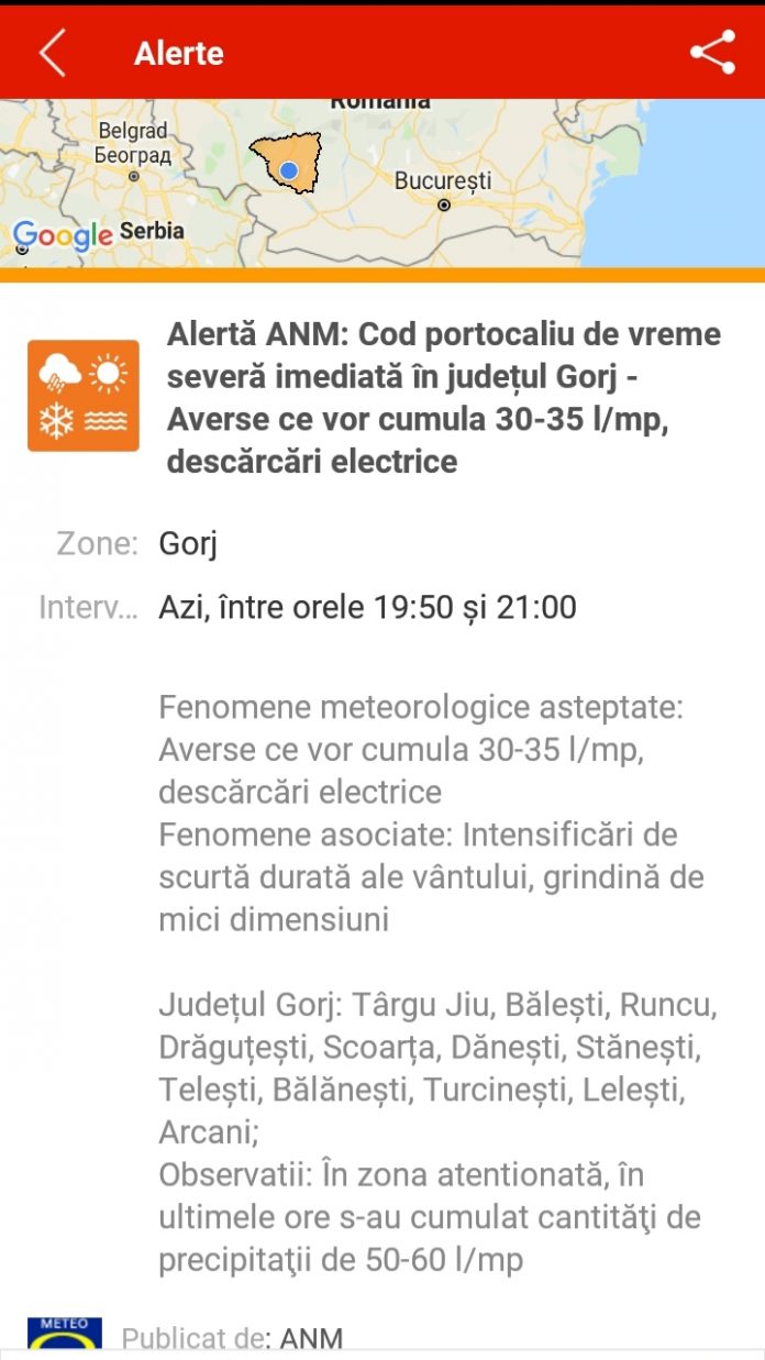 Alertă: Cod portocaliu de vreme severă imediată, în Gorj
