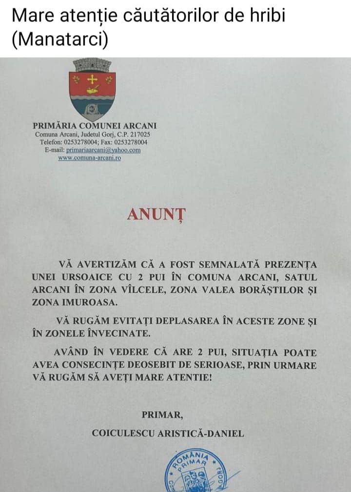 Primarul comunei Arcani, Aristică Coiculescu, a avertizat, în urmă cu aproximativ o oră, pe pagina oficială a instituției, despre apariția unei ursoaice cu doi pui, animalele fiind văzute în treii zone ale satului Arcani.