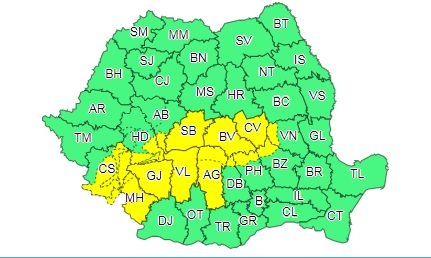 Judeţele parţial vizate de atenţionarea Cod galben sunt Vrancea, Buzău, Prahova, Dâmboviţa, Alba şi Hunedoara, respectiv integral judeţele Covasna, Braşov, Sibiu, Argeş, Vâlcea, Gorj, Caraş-Severin şi Mehedinţi.