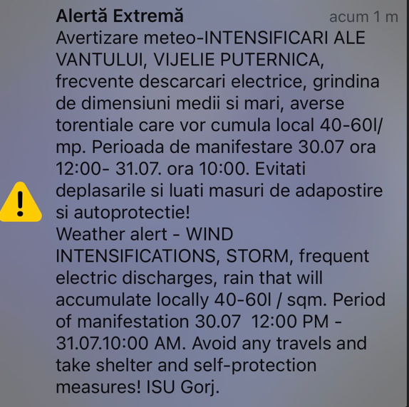 De asemenea, a fost emis mesaj RO-ALERT pe întreg teritoriul judeţului Gorj, în vederea avertizării populației cu privire la fenomenele meteorologice prognozate pentru această perioadă.