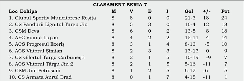 CSM Reșița s-a impus în meciul disputat pe Stadionul ,,Cristinel Răducan” din Târgu Cărbunești și are un bilanț perfect în Seria 7 a Ligii a treia. Băieții lui Dan Alexa au câștigat cu 5-2 jocul cu Gilortul și au ajuns la 8 victorii consecutive. Succesul din Gorj i-a distanțat pe bănățeni la 6 puncte în fața Pandurilor, asta și pentru că echipa lui Călin Cojocaru a remizat acasă cu Jiul Petroșani, scor 0-0. După meci, antrenorul vizitatorilor a declarat că echipa lui Mihai Dinu este mai bună decât o arată clasamentul. Apoi, Alexa și-a îndreptat atenția către Pandurii Târgu-Jiu. Cele două formații se întâlnesc, sâmbătă, în Valea Domanului. „Un joc pe care puteam să-l închidem mai repede, dar iarăşi am ratat situaţii. Am întâlnit Gilortul Cărbuneşti, o echipă cu jucători care pot face diferenţa, o formaţie care este peste locul pe care îl ocupă în clasament. În continuare ratăm nepermis de mult, am primit şi două goluri care, cred eu, puteau fi foarte uşor evitate. Dar, una peste alta, e a opta victorie, echipa a arătat mult mai bine decât cu Lupacul. Pe lângă cele cinci goluri, cred că am mai ratat încă cinci ocazii mari, imense chiar. E un parcurs bun, dar trebuie să rămânem modești, pentru că a trecut abia un sfert din actualul campionat. Ne așteaptă derbiul cu Pandurii, care este, din punctul meu de vedere, principala noastră contracandidată la locul I. Trebuie să tratăm jocul foarte serios. Îmi pare rău pentru accidentarea lui Velcotă, sper să nu fie ceva grav, deoarece e un jucător important pentru noi”, a declarat Dan Alexa, potrivit radioresita.ro. Runda cu numărul 9 mai propune un duel interesant pentru gorjeni. Satelitul Viitorului întâlnește, vineri, Gilortul.