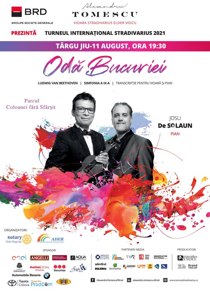 Clubul Rotary din Târgu Jiu împreună cu Asociația pentru Democrație Educație Respect organizează luna viitoare, în data de 11 august 2021, ora 19:30, în Parcul Coloanei fără Sfârșit din Târgu Jiu Turneul Stradivarius 2021 – Odă Bucuriei. Celebrul Alexandru Tomescu va oferi publicului iubitor de muzică clasică o seară de neuitat.
