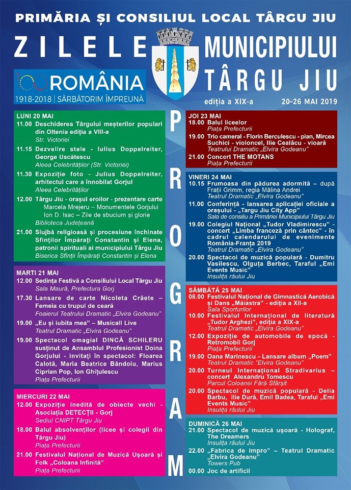 Primăria și Consiliul Local al Municipiului Târgu-Jiu organizează în perioada 20-26 mai cea de-a XIX-a ediție a Zilelor Municipiului Târgu Jiu 2019.