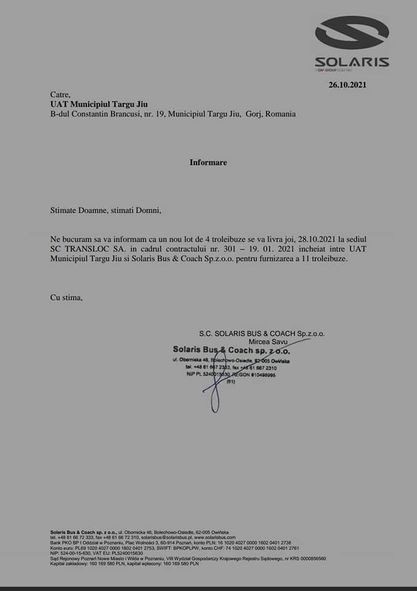 Patru noi troleibuze vor ajunge joi la Târgu Jiu. „Tocmai am primit adresa cu termenul de livrare de la Solaris. Așa cum am mai spus, societatea care ne livrează mijloacele de transport în comun este una foarte serioasă. Avem deja 5 troleibuze noi care au intrat pe trasee, iar celor 4 le vor urma încă 2 care vor completa primul lot prevăzut în proiectul pe fonduri europene de care s-a vorbit foarte mult în ultima perioadă. Anul viitor vom primi încă 9 troleibuze, urmând, totodată, să debuteze al doilea proiect cu finanțare europeană și care prevede încă 15 mijloace de transport electrice, reabilitarea întregii infrastructuri și multe altele”, a anunțat primarul municipiului Târgu-Jiu, Marcel Romanescu. „Am început să culegem roadele de pe urma proiectelor cu finanțare europeană aprobate deja. Sunt aproximativ 70 de milioane de euro și urmează multe alte proiecte pentru că suntem pregătiți să accesăm întreaga sumă ce ne revine pe actualul exercițiu bugetar și care se ridică acum la valoarea de 115 milioane de euro. Este adevărat că procedurile sunt complicate și de durată, dar în final municipiul Târgu Jiu va câștiga enorm de pe urma acestor investiții”, a mai spus edilul.