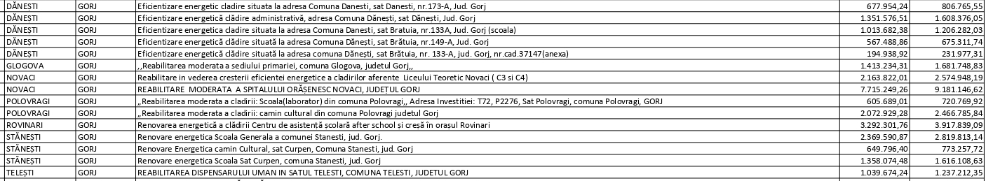 Șapte primării din Gorj vor beneficia de fonduri nerambursabile pentru implementarea de proiecte ce vizează reabilitarea energetică a unor instituţii publice (medicale, sociale, culturale, de învăţământ, administrative). Comuna Dănești are aprobate cinci proiecte, iar Stănești alte trei, pentru reabilitări de școli sau cămine culturale. Primăria din Novaci a cerut bani pentru reabilitarea liceului și a spitalului, în vreme ce Primăria Glogova va primi peste 1.5 milioane lei pentru „reabilitarea moderată a sediului primăriei”.