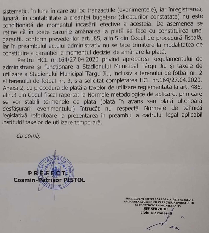 Prefectul de Gorj, Cosmin Petrișor Pistol, consideră printr-o adresă oficială că hotărârea de CL Târgu Jiu din 10 septembrie 2020, care a stabilit amânarea la plata chiriei pentru stadion și complexul sportiv municipal, pentru un an, pentru Clubul Pandurii, este ilegală. Mai precis, HCL 372 de luna trecută nu putea să acorde această facilitate clubului de fotbal, deoarece încalcă legea. Plățile clubului către primărie, amânare prin hotărâre, urmau să fie achitate conform HCL 164 din 27 aprilie 2020.