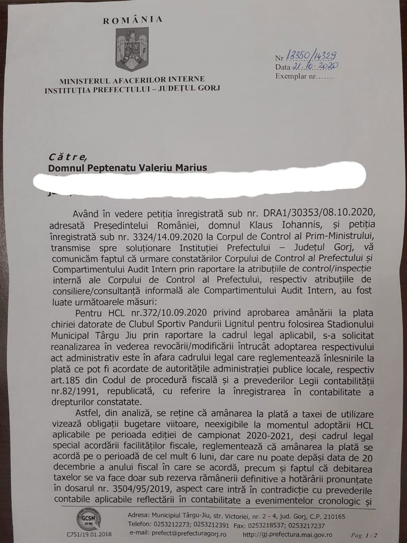 La Secretariatul General al Guvernului a fost trimisă o petiție în septembrie prin care se contestă legalitatea hotărârii de CL Târgu Jiu cu numărul 372. Este vorba despre hotărârea prin care Marcel Romanescu a propus consilierilor o amânare de un an la plata chiriei către municipalitate a clubului de fotbal condus de Marin Condescu.