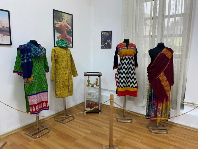”Expoziția vernisată constă în 37 de obiecte tradiționale pe care Ambasada Indiei în România, Albania& Moldova le-a donat în luna octombrie Muzeului Județean Gorj. Colecția de obiecte tradiționale cuprinde, printre altele: veste bărbătești, sari-uri, rochii, șaluri, cutii de bijuterii, vase împletite din bambus, tablouri, etc.
