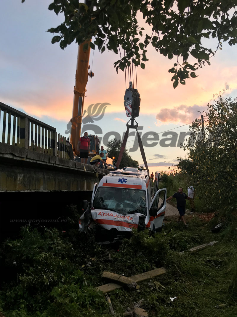 ce aparține SAJ Mehedinți, care transporta un pacient confirmat pozitiv cu virusul COVID-19. Ambulanța a părăsit partea carosabilă și a căzut de pe un pod. La fața locului s-au deplasat două autospeciale pentru descarcerare din cadrul Detașamentului de Pompieri Târgu-Jiu, precum și patru ambulanțe SAJ. În urma impactului au rezultat patru victime, conștiente și neîncarcerate, fiind vorba despre trei membri ai echipajului ce încadrau ambulanța și pacientul. Toate cele patru victime prezintă leziuni. Echipajele de intervenție sosite la fața locului le-au acordat primul ajutor calificat victimelor, ulterior acestea fiind transportate la UPU Târgu-Jiu”, a transmis ISU Gorj. La locul accidentului a venit și un director al Ambulanței Mehedinți, care a confirmat că pacientul din salvarea avariată era infectat cu noul coronavirus și era transportat de la Orșova spre Târgu-Jiu. Din cauza stării pacientului respectiv oamenii au păstrat distanța de salvarea distrusă, nedorind să aibă de-a face cu temutul COVID-19. Inițial, aceștia nu au știut, iar când au încercat să ajungă la echipajul medical cineva din ambulanță le-a transmis oamenilor să stea la distanță. La locul accidentului s-au format cozi kilometrice, șoseaua fiind una intens circulată. Traficul a fost oprit temporar pentru cercetările făcute de polițiști la fața locului, dar și pentru ca o macara să ridice ambulanța de sub pod și să o readucă la nivelul șoselei pentru a putea fi transportată cu o platformă la un service auto. Șoferul considerat responsabil pentru cele