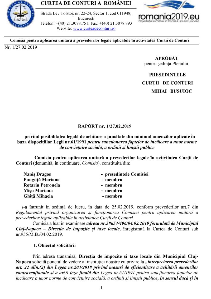 Mai exact, la finalul lunii februarie, Curtea de Conturi a României vine cu clarificări, arătând că organismele care aplică sancțiuni în baza Legii 61/1991, act normativ cu carater special, nu trebuie ,,să aplice prevederile privind achitarea a jumătate din minimul amenzii”, lucru care însă la Târgu-Jiu s-a interpretat greșit.