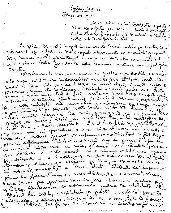 În zilele de crudă tragedie pe care le trăiește întreaga școală românească azi, sufletul ei, deși oropsit și deprimat își îndreaptă privirile către icoana acelui părinte al ei, care i-a dat odinioară atâta viață și-i închină toate gândurile către nemurirea aceluia care a fost Spiru Haret. Niciodată școala primară n-a avut un prieten mai devotat, un sprijinitor mai cald și un îndrumător mai de folos ca Spiru Haret. Căci nimeni în Țara asta n-a avut viziunea mai clară în marile rosturi ale țărănimii, luminată de flacăra idealistă a școalei primare. Toată munca și toată truda lui a fost irosită neprecupețit pentru ridicarea sufletului țărănimei la conștiința demnă și viguroasă a marilor tradiții ale Neamului românesc.