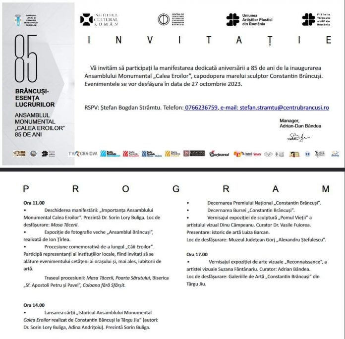 Centrul de Cercetare, Documentare și Promovare „Constantin Brâncuși” organizează manifestarea „Brâncuși – Esența lucrurilor”, dedicată aniversării a 85 de ani de la inaugurarea Ansamblului Monumental „Calea Eroilor” din Târgu Jiu, în data de 27 octombrie 2023. Aceasta va debuta cu procesiunea de parcurgere a ansamblului, în memoria soldaților români căzuți în Primul Război Mondial, urmată de o expoziție de fotografie veche a operelor brâncușiene din oraș (realizată de Ion Țîrlea), două evenimente expoziționale ale artiștilor vizuali Suzana Fântânariu și Dinu Câmpeanu, lansare de carte privind istoricul capodoperei (autori: dr. Sorin Lory Buliga și Adina Andrițoiu), acordarea Premiului Brâncuși și a Bursei Brâncuși pentru activitatea artistică a anului 2022.