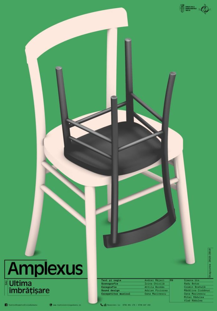 Prețul unui bilet la premieră este de 30 de lei, accesul fiind permis și posesorilor de abonamente ”Aristița Romanescu”. “Amplexus (sau Ultima îmbrățișare)” este o piesă-atmosferă, în care viața se preface-n amintire. Pe ritmurile ABBA se produce decorticarea unui sfârșit. Aici, noi-spectatorii putem fi oricând noi-personajele. Transparența scandinavă, minimalismul cromatic, gesturile de un ritualism homemade fac casă bună cu nefericirea unui crepuscul. Corul (care pastișează cel mai cunoscut band muzical suedez) este cel care organizează vizita privitorilor. Sub ochii noștri, tragedia se naște în familie. Într-un viitor apropiat, o societate distopică provoacă desfășurarea dicteului agoasant al protagonistului, conturând o detăinuire testamentară. Aici, oamenii au aproape totul, dar viața are o durată prestabilită. Încolțit de moarte, tatăl simte că i-au mai rămas multe de făcut înaintea morții ceremonios organizate de această societate. Receptorii dramei sunt mama și fiul. Femeia protestează original la adresa ordinii sociale, îndepărtându-se de lume, întorcând spatele plecării soțului, schițând astfel un poem ermetic, dar și tensiunea așteptării chipului. Dar fiul este supremul receptor, obligat să înțeleagă dorința de evadare a tatălui și condamnat s-o perpetueze: “Privirea modifică lumea. Ne uităm în ea şi ea se uită în noi. Toată copilăria am avut urâtul sentiment că locuim într-un decor de teatru, și că pereții – pereți și masa – masă și scaunul – scaun, toate nu erau altceva decât niște minciuni. Decoruri, butaforie și culise. Dar noi, oricât de fake am fi fost, eram totuși vii, și nimeni – nimeni nu ne-ar fi putut juca drama mai bine decât o făceam noi”, a declarat regizorul Andrei Măjeri.