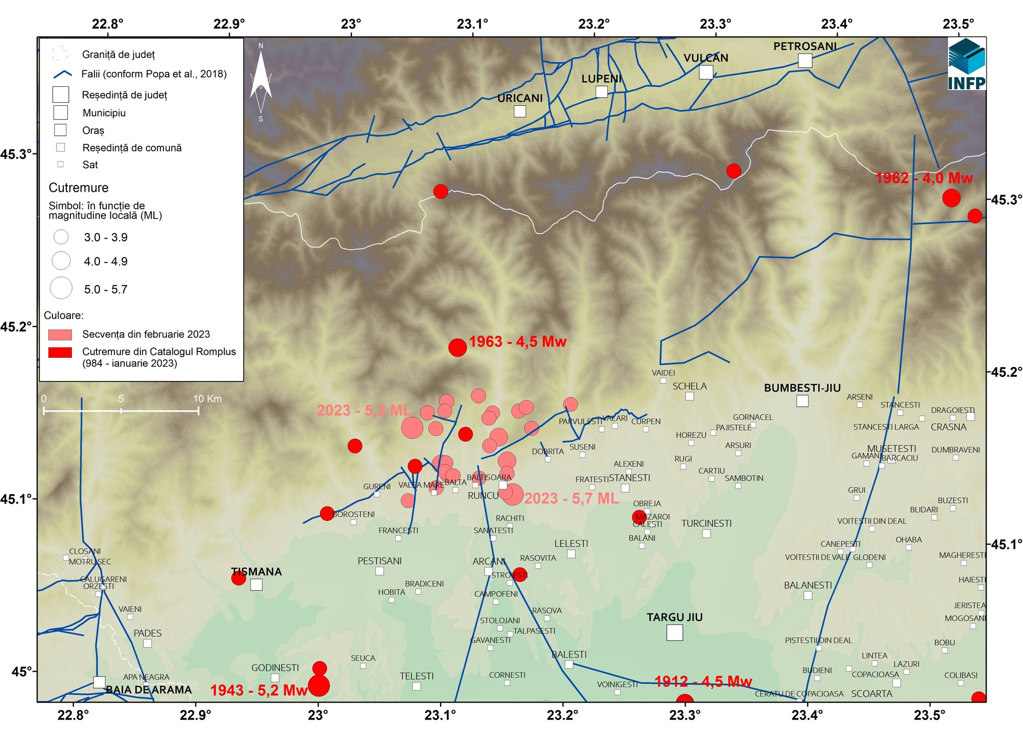 Cutremurele de 5,2 şi 5,7 care s-au produs în Gorj pe 13 şi 14 februarie au avut până acum 810 replici,  a anunţat, marți, Institutul Naţional de Cercetare şi Dezvoltare pentru Fizica Pământului (INFP) care a publicat şi hărţi care arată detalii noi despre caracteristicile seismelor.