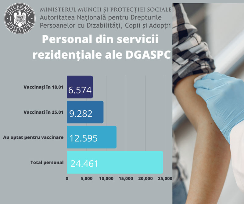 Autoritatea Națională pentru Drepturile Persoanelor cu Dizabilități, Copii și Adopții (ANDPDCA) a publicat, miercuri, situația vaccinărilor din serviciile rezidențiale aflate în subordinea DGASPC. Astfel, la nivel național, din 12.595 de angajați care au optat pentru vaccinare, au primit deja prima doză 9.282 de persoane. Raportarea este aferentă datei de de 25 ianuarie 2021.