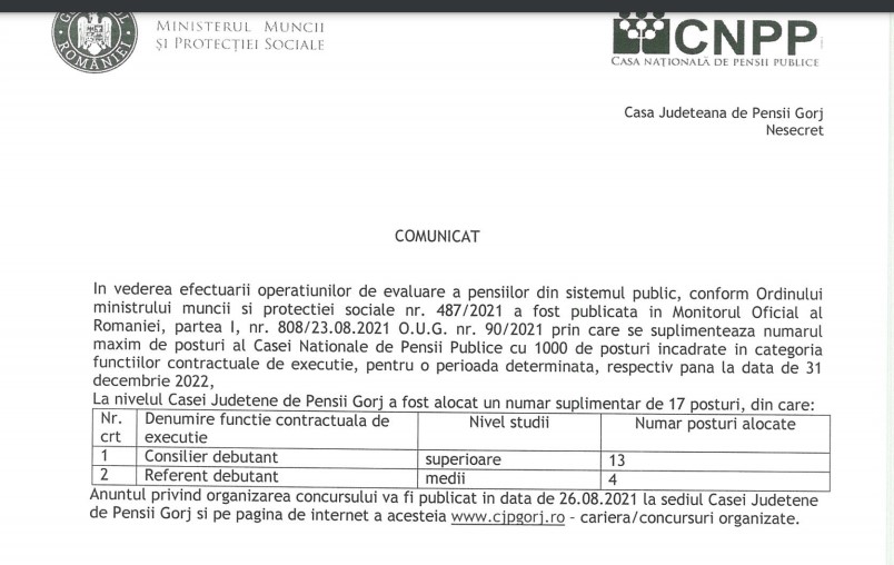 Casa Județeană de Pensii Gorj va angaja 17 persoane pe perioadă determinată. Chiar şi cei fără experienţă pot participa la selecţie, dacă au abilităţi şi competenţe pentru a lucra la procesul de evaluare și digitalizare a dosarelor de pensie.