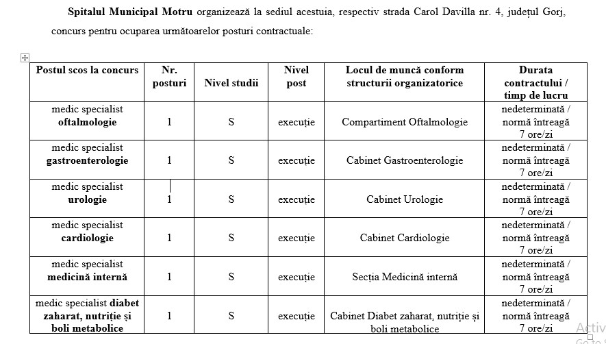 Noi angajări în sistemul sanitar din Gorj. După Spitalul Județean, alte două unități sanitare anunță organizarea de concursuri pentru ocuparea posturilor vacante. De pildă, Spitalul Municipal Motru are nevoie de șase medici, în timp ce spitalul din Cărbunești caută un specialist pentru cabinetul de planning familial.