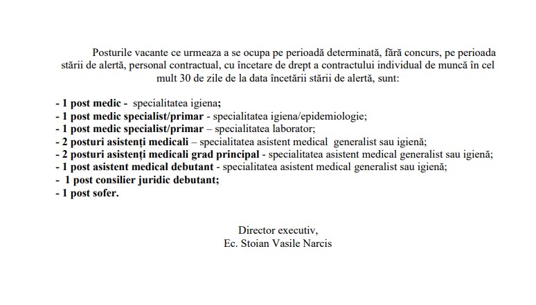 Direcția de Sănătate Publică Gorj face angajări fără concurs, pe perioada stării de alertă. Sunt trei posturi de medici, cinci posturi de asistenți medicali, unul de consilier juridic debutant și un post de șofer.