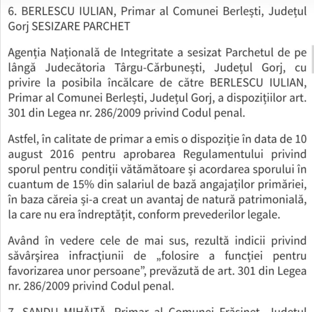 Agenția Națională de Integritate anunță că a sesizat Parchetul de pe lângă Judecătoria Târgu-Cărbunești, Județul Gorj, cu privire la posibila încălcare de către BERLESCU IULIAN, Primar al Comunei Berlești, Județul Gorj, a dispozițiilor art. 301 din Legea nr. 286/2009 privind Codul penal.