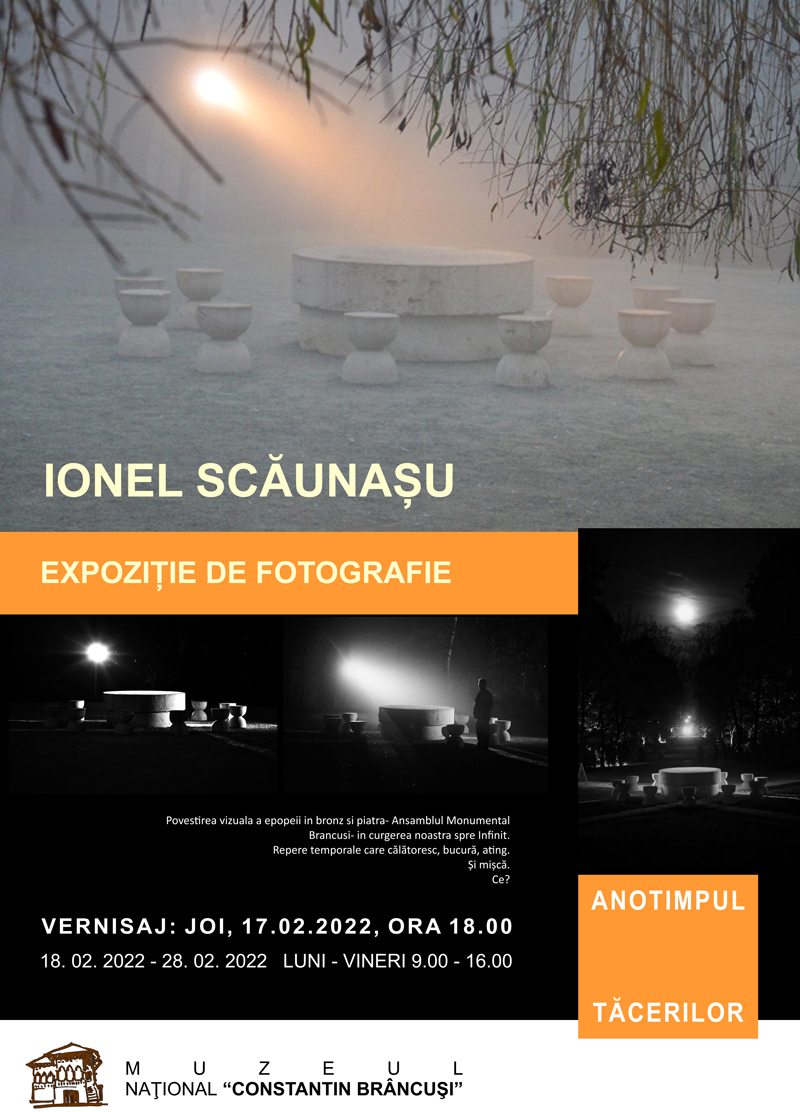 ,,Anotimpul Tăcerilor” – expoziția de fotografie semnată de artistul fotograf Ionel Scăunașu va fi vernisată joi, 17 februarie, ora 18.00, la Muzeul Național ,,Constantin Brâncuși”. Evenimentul se înscrie în seria de manifestări dedicate Zilei Naționale ,,Constantin Brâncuși”, care a debutat la Muzeul Național ,,Constantin Brâncuși” cu proiectul muzical ,,Dezleganie”, susținut de Sergiu Corbu Boldor și închinat marelui sculptor. Expoziția ,,Anotimpul Tăcerilor” aduce pe simezele muzeului peste 60 de lucrări fotografice, care surprind operele ce compun Ansamblul Monumental ,,Calea Eroilor” de la Târgu-Jiu, în cele 4 anotimpuri, la care autorul adaugă cel de-al V-lea anotimp: ,,Anotimpul Tăcerilor”, lucrări realizate pe parcursul mai multor ani. Masa Tăcerii, Poarta Sărutului, Coloana fără Sfârșit, opere atât de familiare târgujienior, sunt prezentate publicului de către artistul fotograf într-o nouă perspectivă, una care ne retrimite către tăcere și meditație.