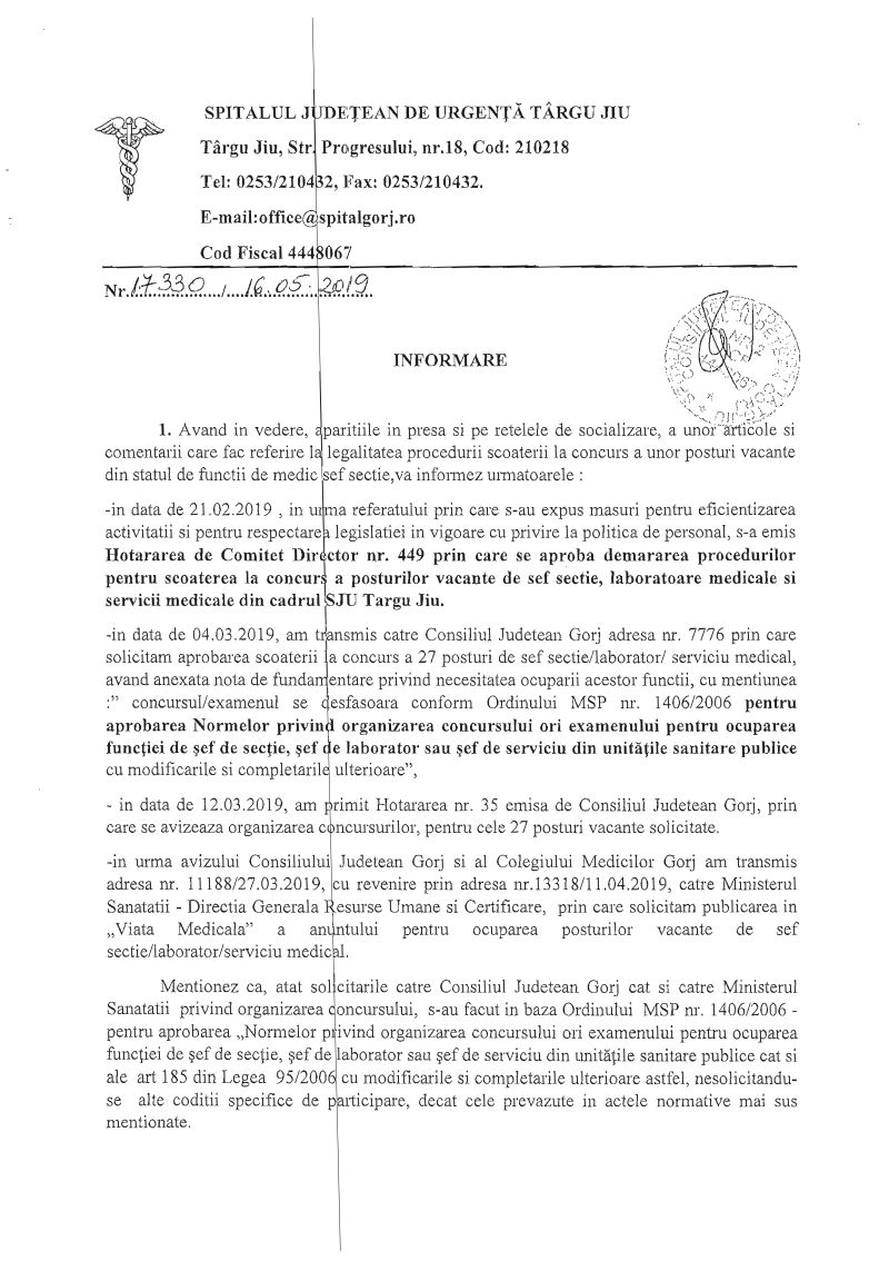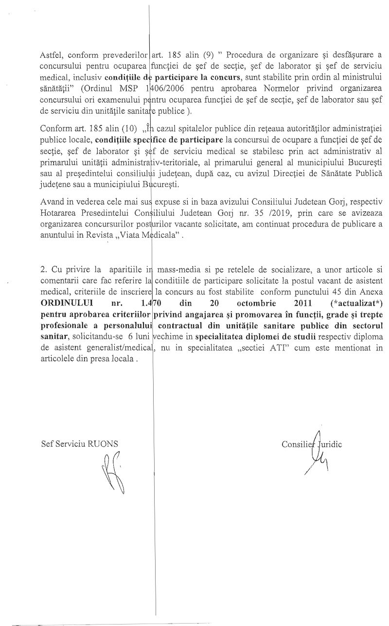 La finalul săptămânii trecute, conducerea SJU Târgu-Jiu a postat pe site-ul propriu o informare, semnată de managerul Gigel Capotă, prin intermediul căreia oficialii spitalului se apără în problema concursurilor contestate din unitatea medicală. Se explică astfel că procedura de concurs ar urma pașii legali, lucru contestat însă de consilierul județean Banța, luni. ,,Se observă din informarea pe care SJU a publicat-o pe site-ul propriu că angajații săi de la juridic nu au habar de lege și oferă un răspuns public lamentabil și pe lângă subiect, cu confuzii grave.