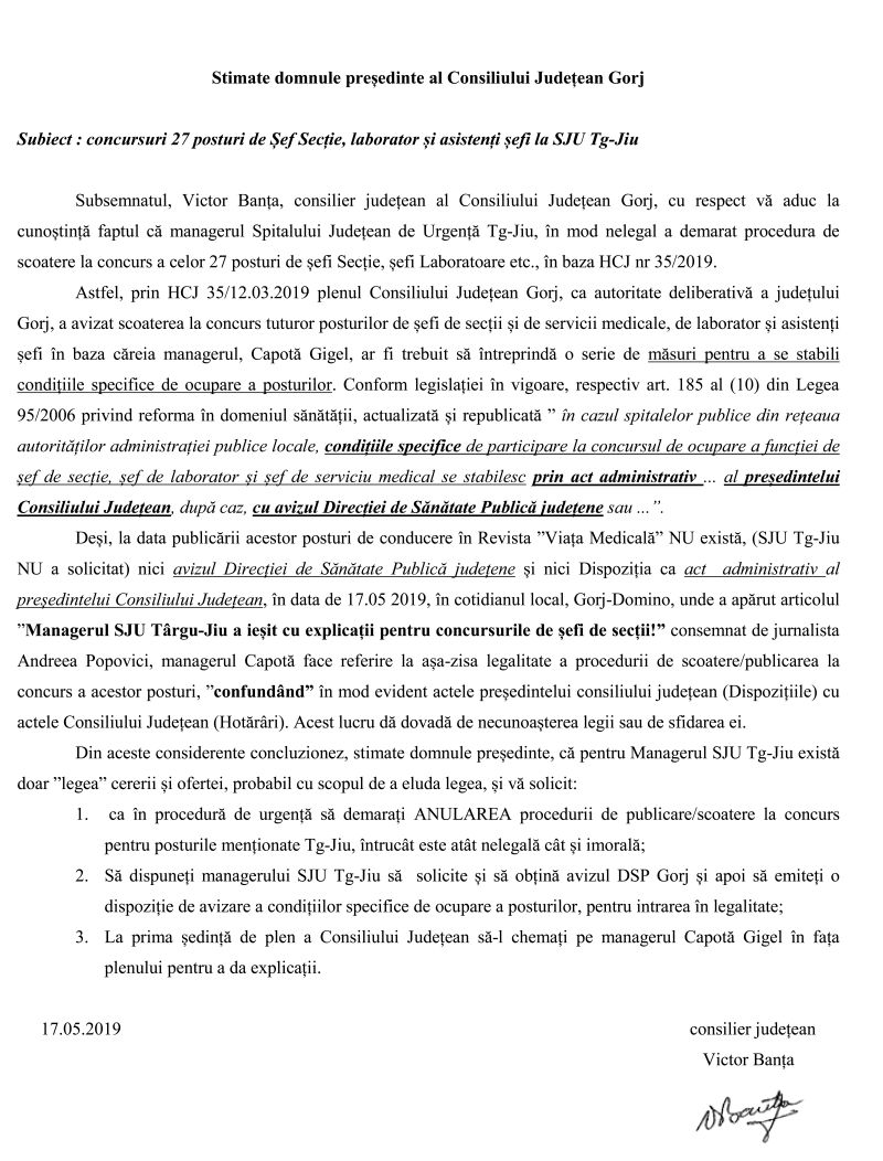 Pe motiv că nu se respectă procedura legală precizată în art.185 al.10 din Legea 95 republicată, consilierul județean liberal Victor Banța a solicitat Consiliului Județean Gorj, pe 17 mai 2019, anularea concursurilor din SJU, mai exact pentru cele 27 de posturi de șef secție, laborator și asistenți șefi ai spitalului județean. ,,De când este Capotă manager mai mult de jumătate dintre concursuri au fost realizate prin transfer eludându-se instituția concursului”, a spus, ieri, Victor Banța.