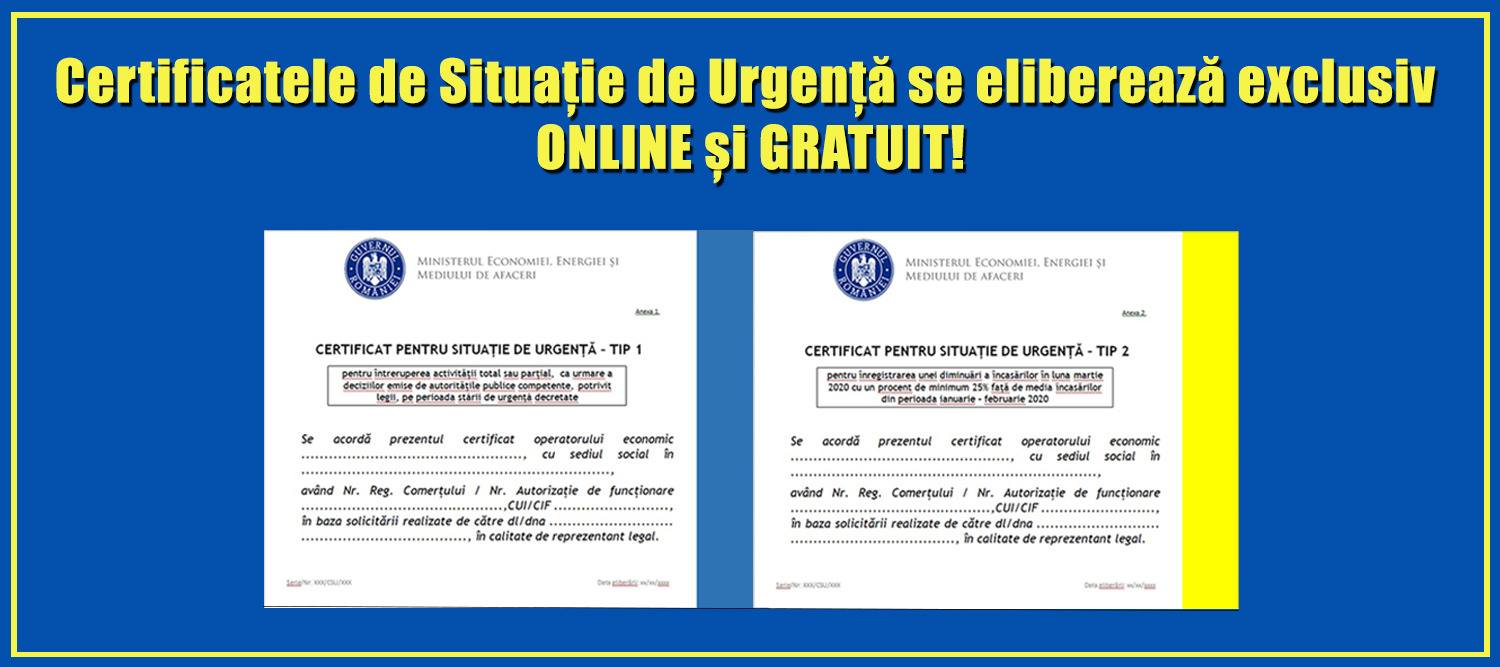 Certificatele de Situație de Urgență sunt emise în două forme: TIP 1 (ALBASTRU) – pentru întreruperea totală sau parțială a activității, ca urmare a efectelor deciziilor emise de autoritățile publice competente, potrivit legii, în perioada stării de urgență decretate (afectați de Ordonanțele Militare) și TIP 2 (GALBEN) – pentru înregistrarea unei diminuări a încasărilor sau veniturilor în luna martie 2020 cu un procent de minim 25% față de media încasărilor sau veniturilor din perioada ianuarie-februarie 2020.