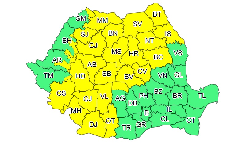 În intervalul 14 iunie, ora 14.00 – 14 iunie, ora 21.00, ANM anunță că vor fi averse în Oltenia, sudul Banatului, Transilvania, local în Moldova, precum și în zonele de munte, iar cantitățile de apă vor depăși 25 l/mp și pe arii restrânse 40…50 l/mp. Îndeosebi în centrul și în nord-estul țării aversele vor avea și caracter torențial, vor fi însoțite de descărcări electrice, intensificări de vânt cu aspect de vijelie și căderi de grindină.