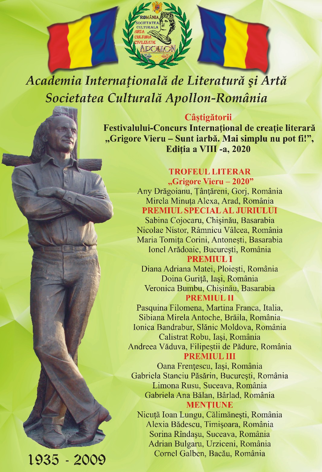 Sâmbătă, 7 martie 2020, începând cu ora 10:00, a avut loc o nouă „LECŢIE DE POEZIE”, la Artoteca Bibliotecii Metropolitane București. Regalul de poezie a început cu Gala decernării premiilor Ediției a VIII – a, a Festivalului Concurs Internațional de Creație Literară „Grigore Vieru”, secțiunea poezie, intitulat „Sunt iarbă, mai simplu nu pot fi!”. Organizatorul festivalului a fost ,,Societatea Culturală Apollon-România”, care, la începutul acestui an, a lansat următorul Regulament al desfășurării concursului: ,,Toate textele se trimit în perioada 14 ianuarie – 14 februarie 2020, la adresa de e-mail a revistei Apollon: ro.tv.kalin@gmail.com. Minimum 10 poezii în limba română, în document Word, A4, caracter de 12, Times New Roman, la 1 rând, obligatoriu cu diacritice, însoțite de o fotografie bust a autorului și un CV literar. Dacă aceste cerințe nu sunt respectate, textele în cauză nu vor intra în concurs. La concurs pot participa toți scriitorii de limbă română, indiferent unde sunt stabiliți. Jurizarea se face între 15 și 28 februarie 2020.
