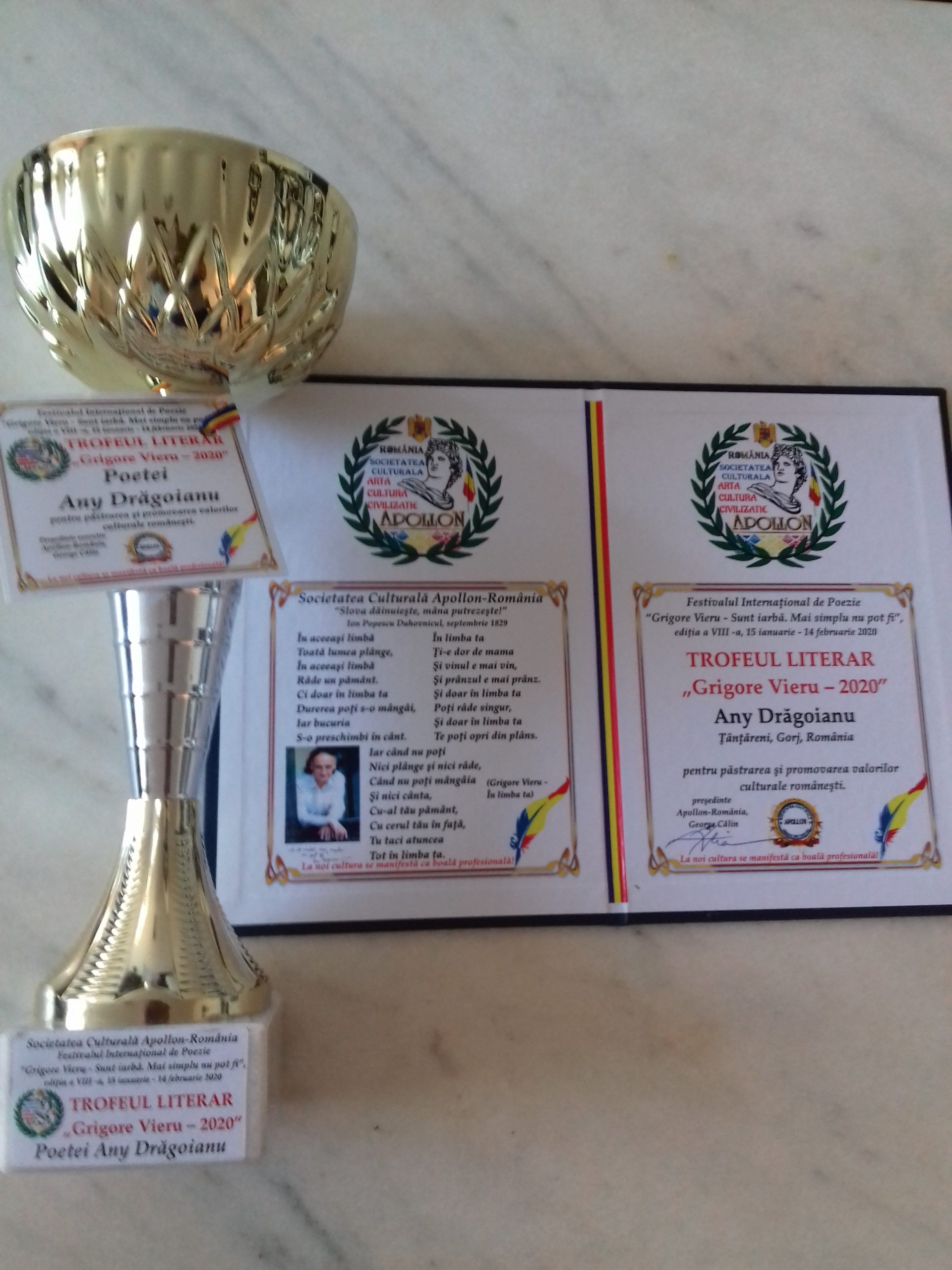 Poeta gorjeană, Any Drăgoianu, membră a Asociației Naționale Cultul Eroilor „Regina Maria” – Filiala Județului Gorj, a trimis 15 poezii din care vă prezint doar una, și a obținut „TROFEUL LITERAR «Grigore Vieru – 2020»”, marele premiu al acestei ediții.