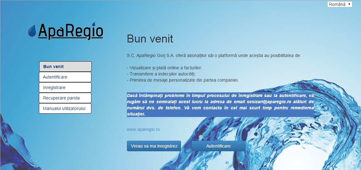 Aparegio Gorj vine în sprijinul abonaţilor săi cu o platformă online care va oferi beneficiarilor posibilitatea de a completa virtual citirea apometrelor, de a achita facturile aferente sau de a înregistra sesizări. Aceasta a fost lansată oficial astăzi. Lansarea platformei online a costat aproximativ 2.800 de euro, şi, deocamdată este disponibilă doar clienţilor persoane fizice, urmând a fi funcţională de luna viitoare şi pentru societăţile comerciale şi instituţiile publice.
