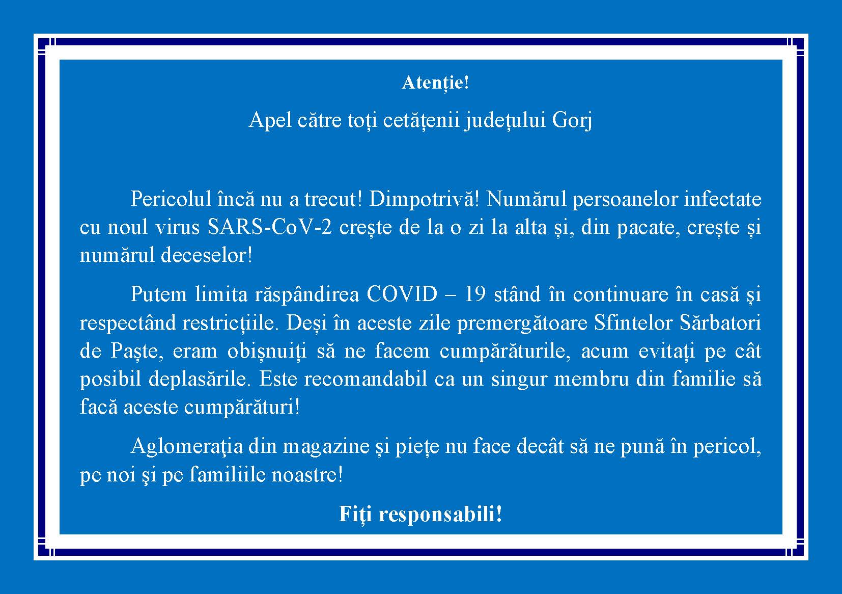 Prefectul județului Gorj, Cristinel Rujan, face apel către toți cetățenii județului Gorj, să respecte, în continuare, cu strictețe, restricțiile impuse prin ordonanţele militare: „Cu toții trebuie să conștientizăm că pericolul nu a trecut și că singurul mod de a limita răspândirea COVID-19, este să păstrăm distanțarea socială, să stăm în casă și să respectăm restricțiile.”