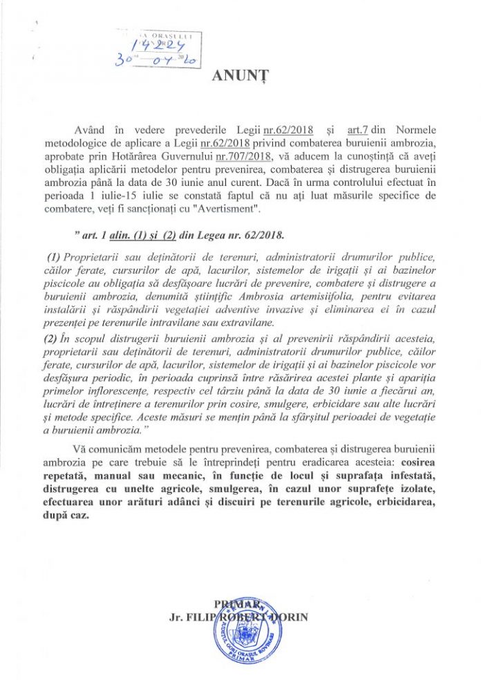Apel către rovinăreni: obligativitatea combaterii ambroziei