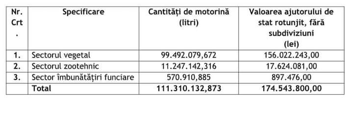 „Valoarea ajutorului de stat acordat sub formă de rambursare care urmează a fi plătită este de 174.543.800,00 lei pentru un număr de 17.181 beneficiari cu cantitățile de motorină determinate cu acciza redusă de 111.310.132,873 litri”, a anunțat APIA.