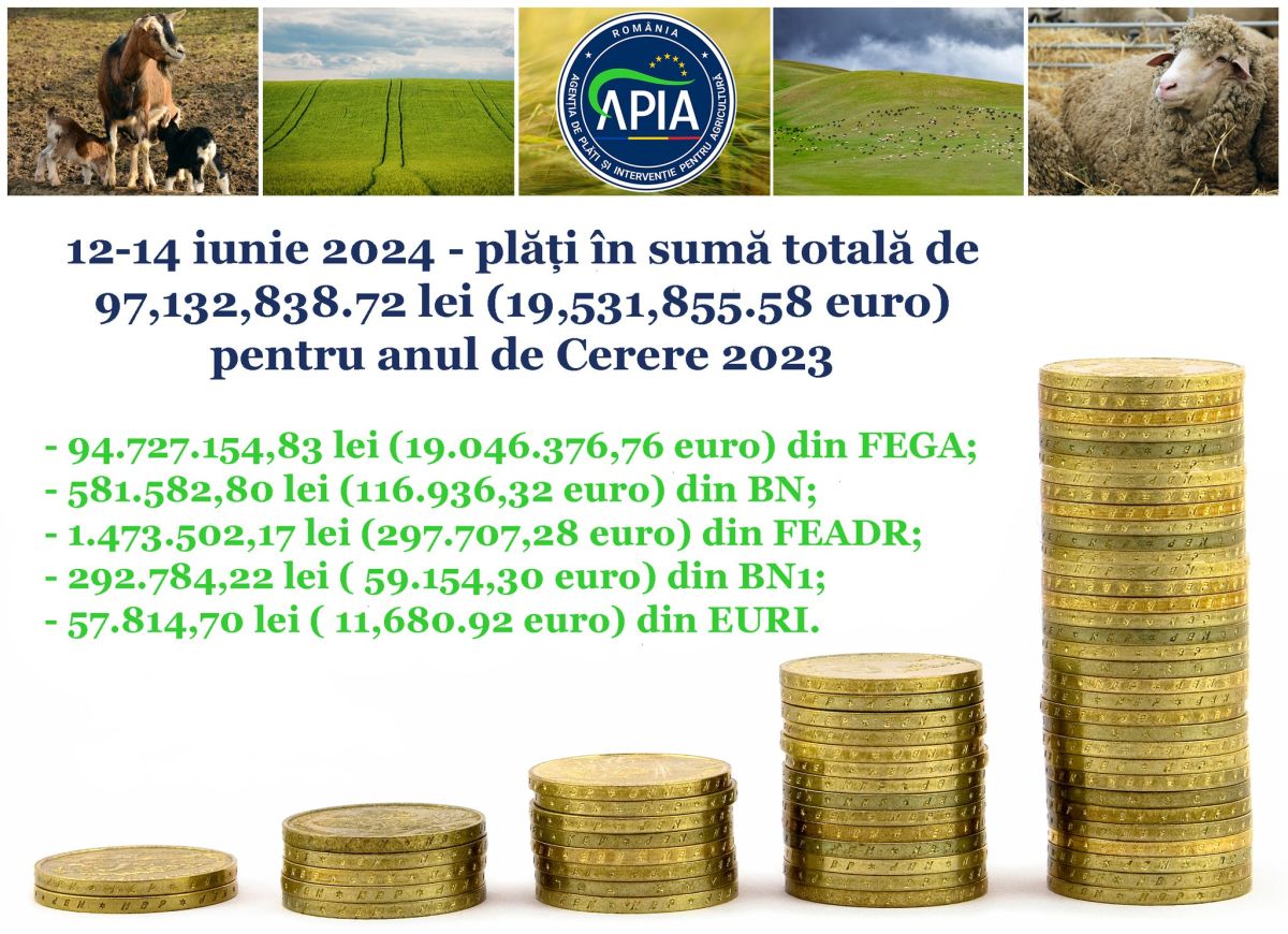 Agenția de Plăți și Intervenție pentru Agricultură (APIA) a efectuat, în perioada 12 – 14 iunie 2024, plăți pentru anul de cerere 2023 în sumă totală 97,132,838.72 lei (19,531,855.58 euro).
