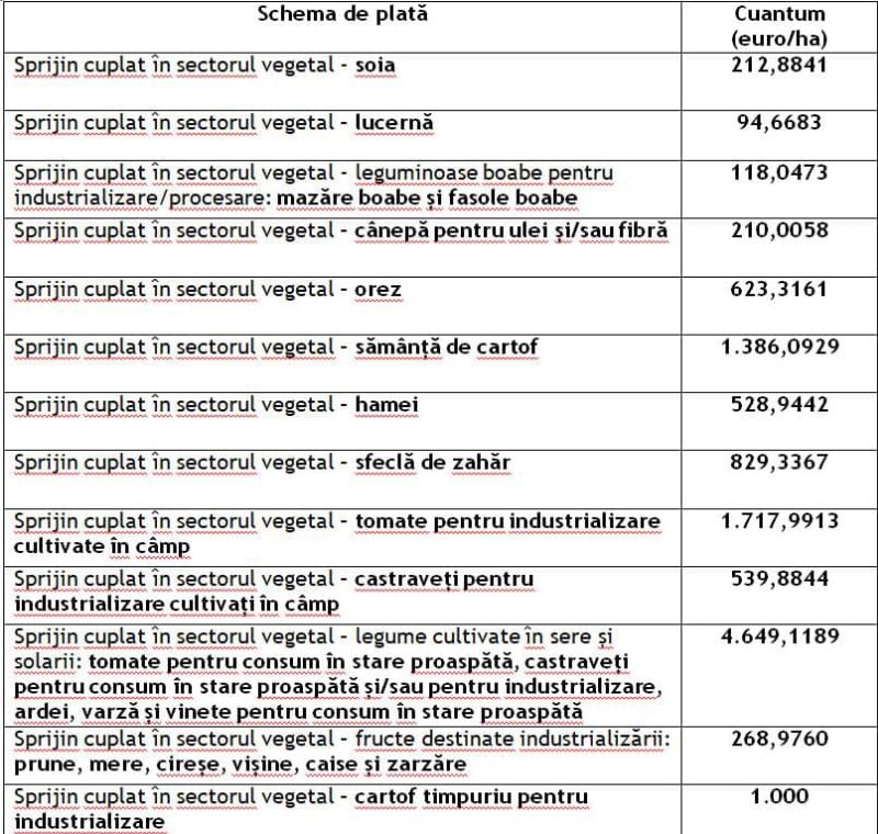 Agenția de Plăți și Intervenție pentru Agricultură (APIA) aduce la cunoștința opiniei publice că sâmbătă, 16 mai 2020, a demarat autorizarea la plată a schemelor de sprijin cuplat în sectorul vegetal Campania 2019. Până acum, au fost autorizați la plată un număr de 30.491 fermieri cu o sumă totală de 54.749.076,22 euro.Potrivit art. 1, alin 6, din Hotărârea de Guvern nr. 351 din 05.05.2020 pentru aprobarea plafoanelor alocate măsurilor de sprijin cuplat în sectorul vegetal pentru anul de cerere 2019 – ,,Cuantumul pe unitatea de măsură pentru fiecare măsură de sprijin cuplat în sectorul vegetal se calculează de către APIA, prin raportarea plafoanelor prevăzute la alin. 5 la suprafețele eligibile pentru anul 2019”, au rezultat cuantumurile din tabelul anexat.Plățile pentru schemele de sprijin cuplat în sectorul vegetal se fac în lei, la cursul de schimb de 4,7496 de lei pentru un euro, stabilit de Banca Centrală Europeană la data de 30 septembrie 2019 și publicat în Jurnalul Oficial al Uniunii Europene, seria C, nr. 329 din 03 octombrie 2019.
