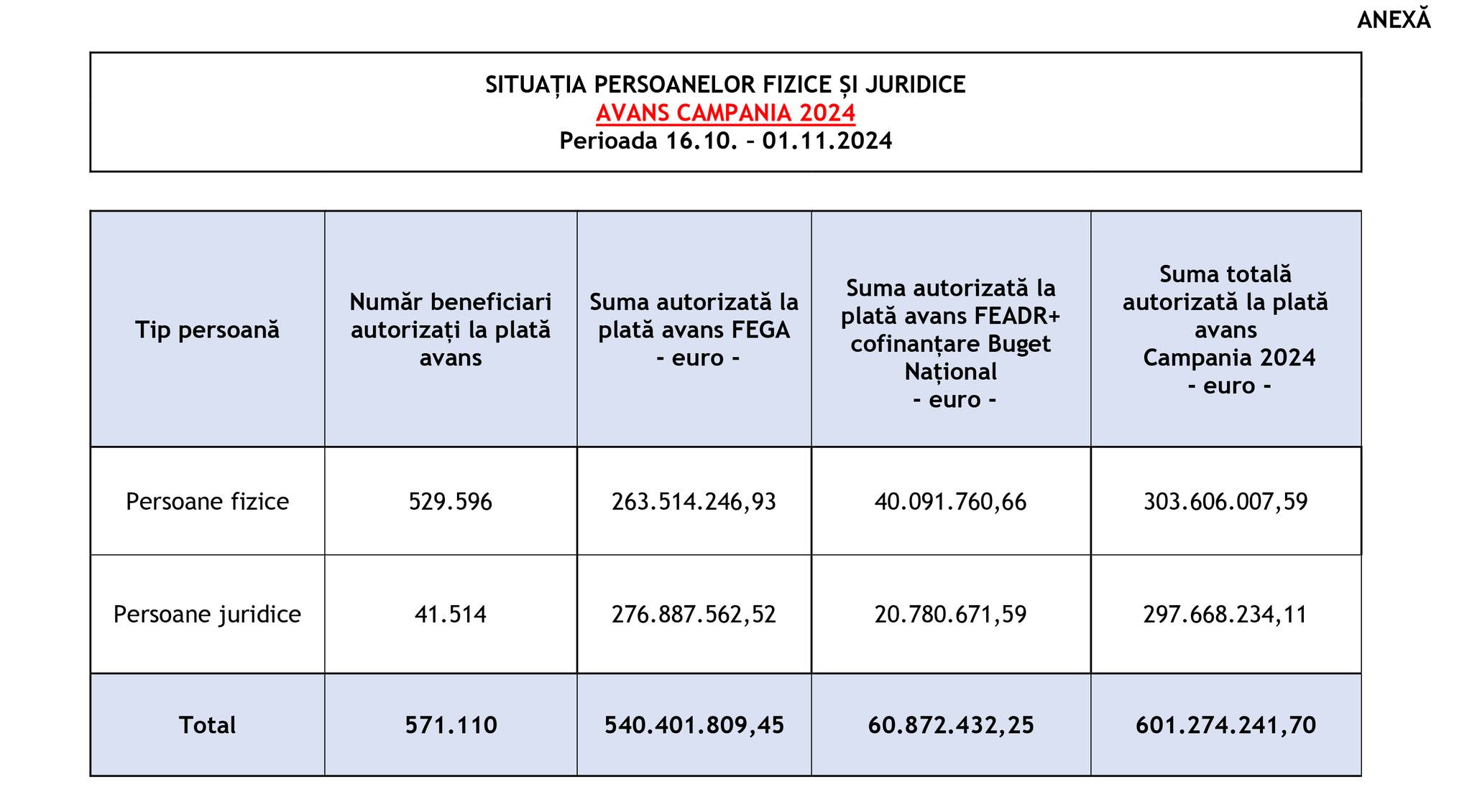 Agenția de Plăți și Intervenție pentru Agricultură (APIA) informează că, în perioada 16 octombrie-1 noiembrie 2024, a autorizat la plată în cadrul Campaniei de plăți în avans, aferentă anului de cerere 2024, un număr de 571.110 fermieri, cu o sumă totală de 601.274.241,70 euro (2.991.537.895,42 lei).