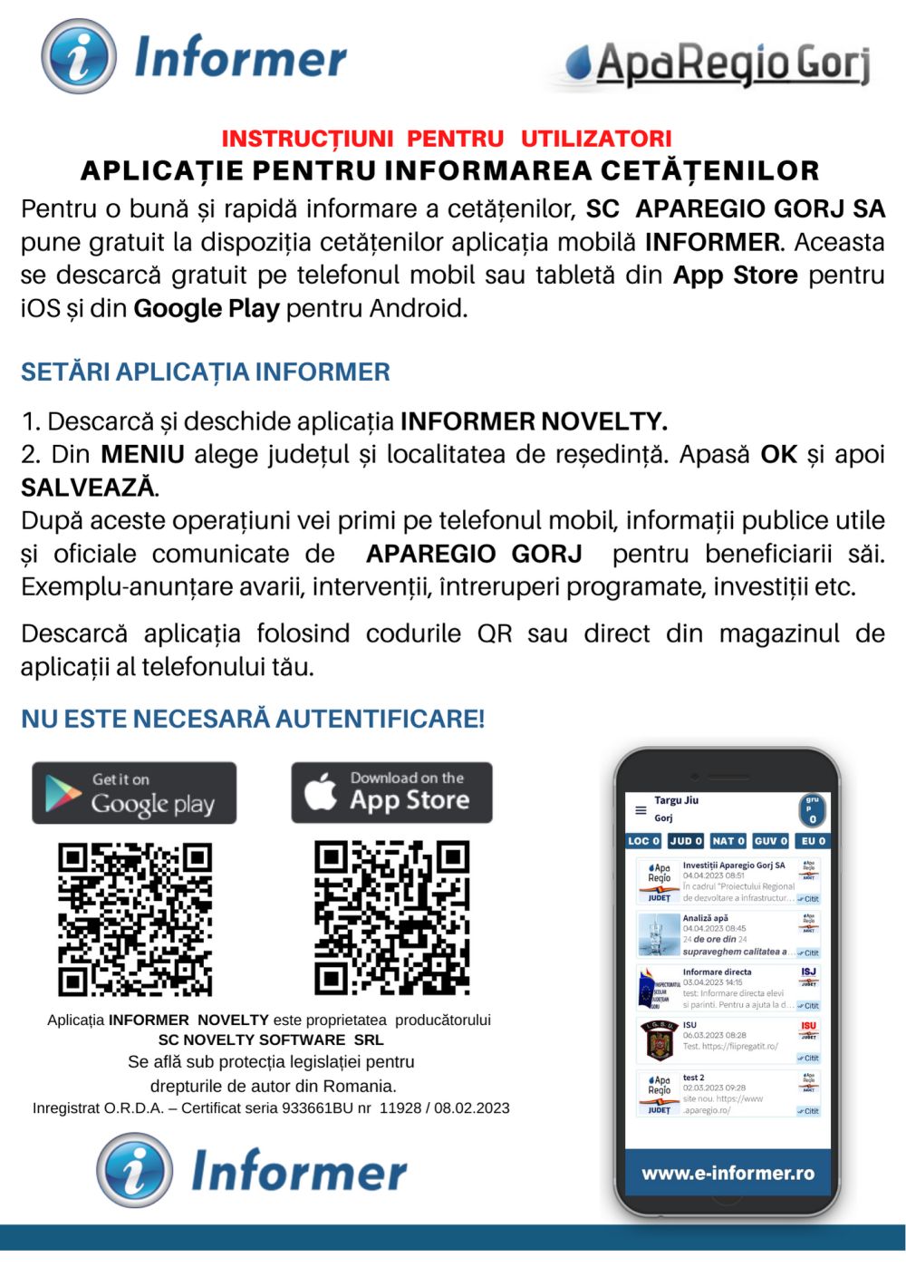 Tot prin intermediul aplicației INFORMER, gorjenii vor putea afla date despre calitatea apei sau vor putea descărca documente utile de pe site-ul APAREGIO GORJ SA cum ar fi: cerere de branșare apă și/sau racord canalizare, cerere obținere aviz definitiv, cerere obținere aviz amplasament, cerere vidanjare, comandă analiză apă etc. De asemenea, utilizatorii aplicației INFORMER vor fi la curent cu proiectele demarate de Aparegio.