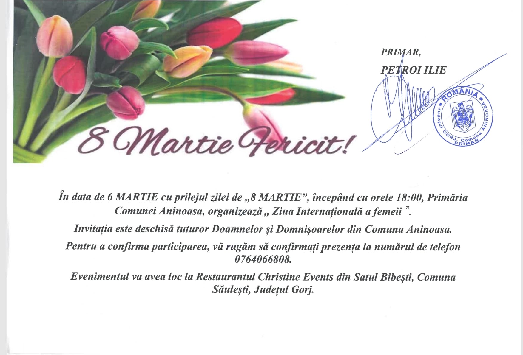 Înscrierile au fost deschise încă de săptămâna trecută, iar deja pe liste s-au trecut sute de participante. Petrecerea va avea loc în data de 6 martie, la un local din satul Bibești, comuna Săulești. Cheltuiala cu această petrecere va fi suportată din bugetul local, cheful de 8 Martie fiind o premieră pentru comuna Aninoasa.