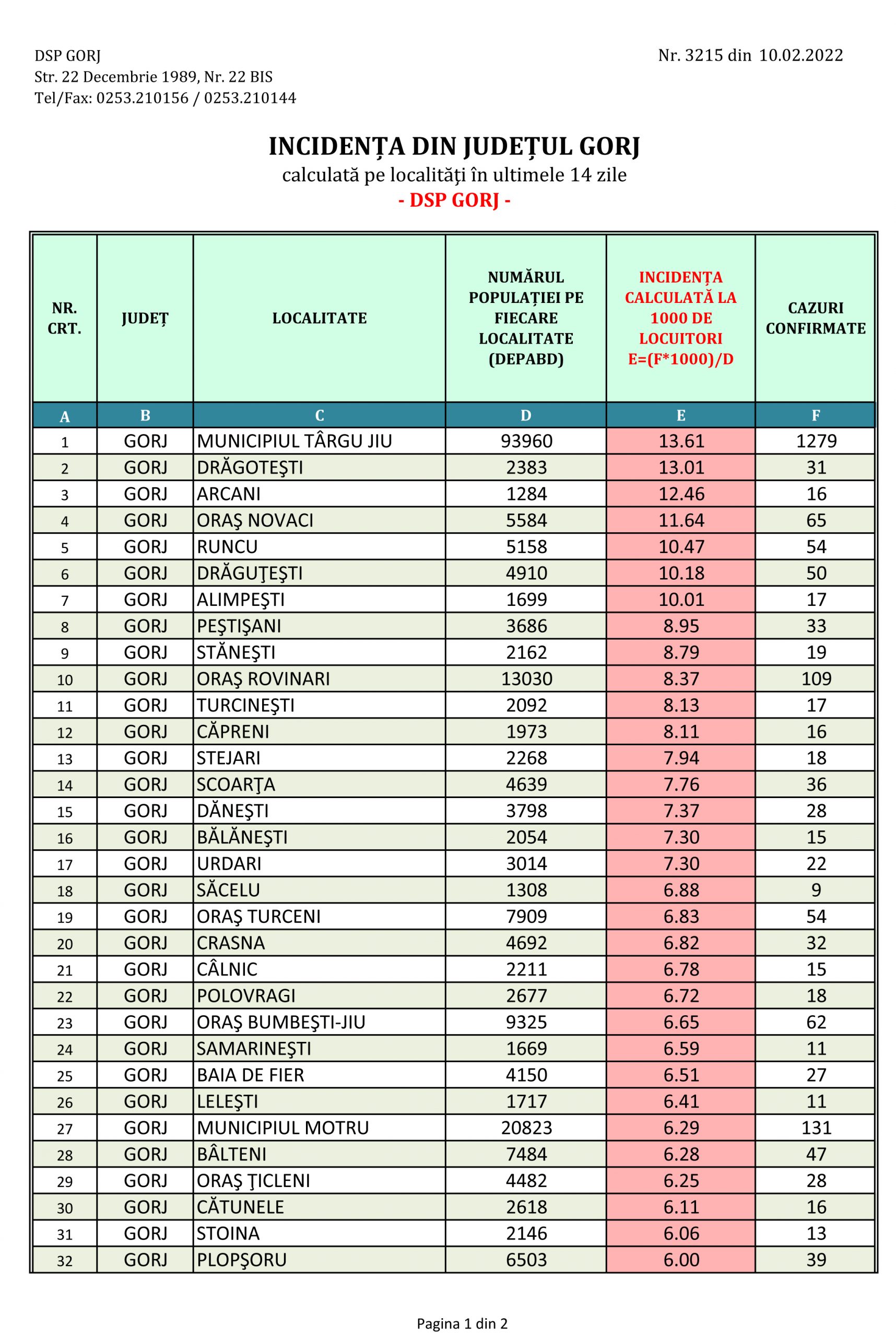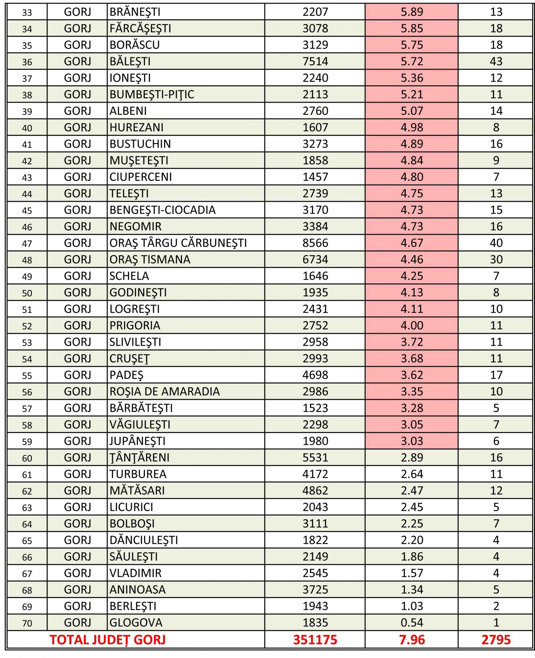 În șapte localități din Gorj, rata de infectare este mai mare de 10 cazuri la mia de locuitori. Este vorba de municipiul Târgu-Jiu, comuna Drăgotești, comuna Arcani, orașul Novaci și comunele Runcu, Drăguțești și Alimpești.