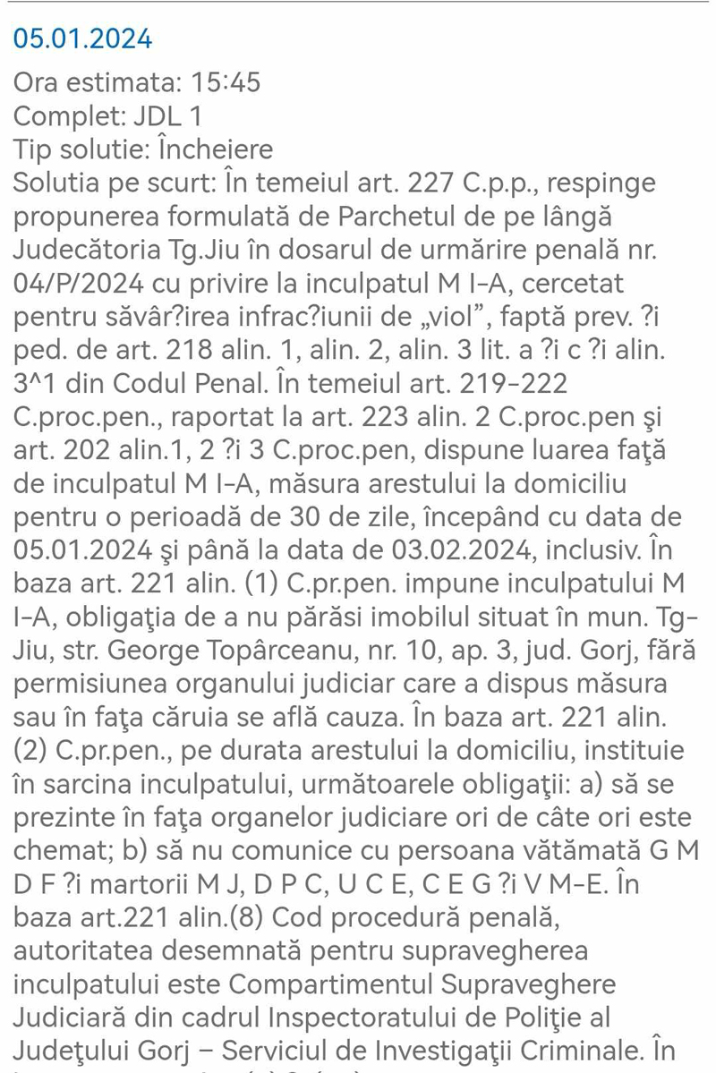 ,,În temeiul art. 227 C.p.p., respinge propunerea formulată de Parchetul de pe lângă Judecătoria Tg.Jiu în dosarul de urmărire penală nr. 04/P/2024 cu privire la inculpatul M I-A, cercetat pentru săvârșirea infracțiunii de „viol”, faptă prev. și ped. de art. 218 alin. 1, alin. 2, alin. 3 lit. a și c și alin. 3^1 din Codul Penal. În temeiul art. 219-222 C.proc.pen., raportat la art. 223 alin. 2 C.proc.pen şi art. 202 alin.1, 2 și 3 C.proc.pen, dispune luarea faţă de inculpatul M I-A, măsura arestului la domiciliu pentru o perioadă de 30 de zile, începând cu data de 05.01.2024 şi până la data de 03.02.2024, inclusiv. În baza art. 221 alin. (1) C.pr.pen. impune inculpatului M I-A, obligaţia de a nu părăsi imobilul situat în mun. Tg-Jiu, str. George Topârceanu, nr. 10, ap. 3, jud. Gorj, fără permisiunea organului judiciar care a dispus măsura sau în faţa căruia se află cauza. În baza art. 221 alin. (2) C.pr.pen., pe durata arestului la domiciliu, instituie în sarcina inculpatului, următoarele obligaţii: a) să se prezinte în faţa organelor judiciare ori de câte ori este chemat; b) să nu comunice cu persoana vătămată G M D F și martorii M J, D P C, U C E, C E G și V M-E. În baza art.221 alin. (8) Cod procedură penală, autoritatea desemnată pentru supravegherea inculpatului este Compartimentul Supraveghere Judiciară din cadrul Inspectoratului de Poliţie al Judeţului Gorj – Serviciul de Investigaţii Criminale. În baza art. 221 alin. (4) și (11) C.pr.pen., atrage atenţia inculpatului că în caz de încălcare cu rea-credinţă a măsurii sau a obligaţiilor care îi revin ori, dacă există suspiciunea rezonabilă că a săvârşit cu intenţie o nouă infracţiune pentru care s-a dispus punerea în mişcare a acţiunii penale împotriva sa, măsura arestului la domiciliu poate fi înlocuită cu măsura arestării preventive, în condițiile prevăzute de lege. Dispune punerea de îndată în libertate a inculpatului M I-A reţinut”, se arată în sentința magistraților Judecătoriei Târgu Jiu.