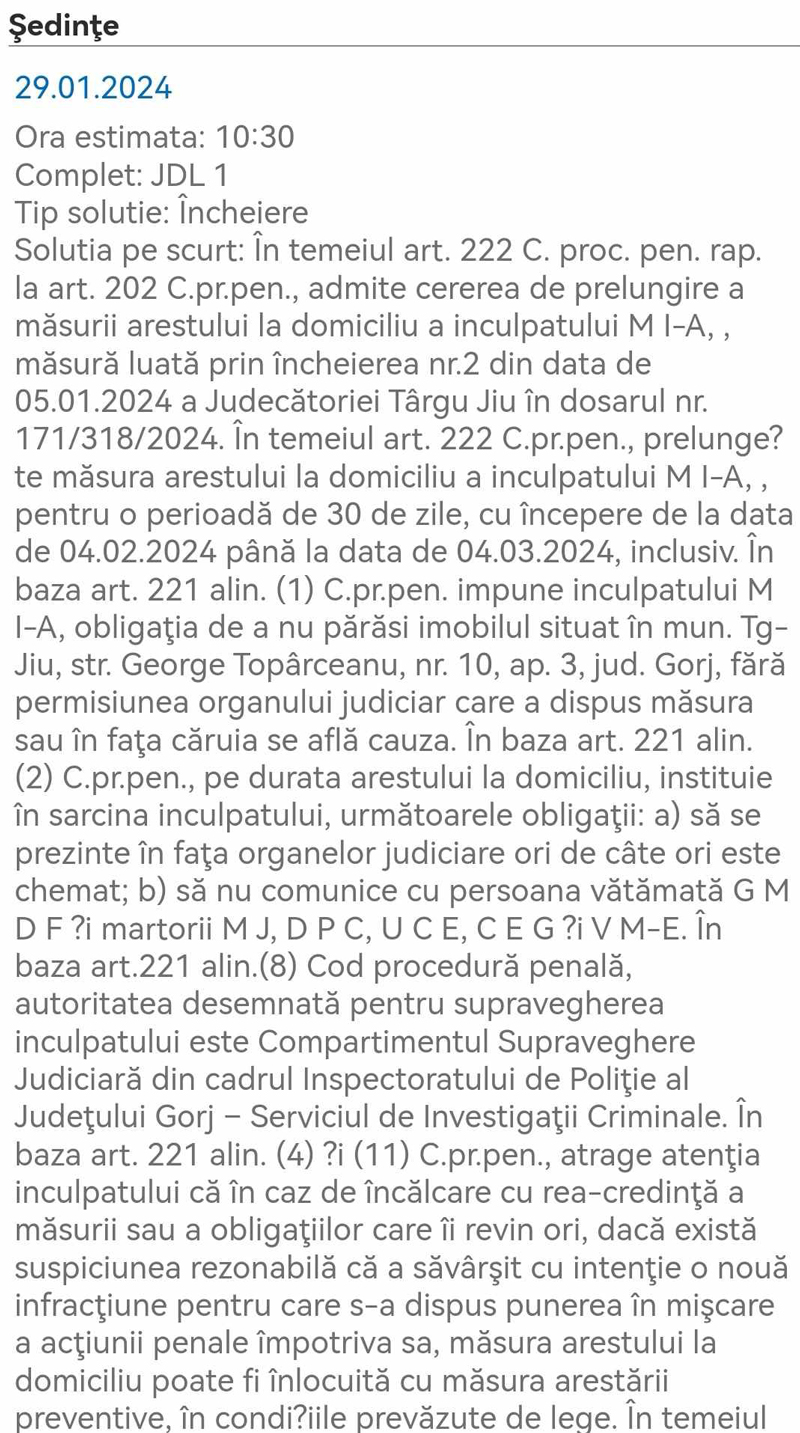 „În temeiul art. 222 C. proc. pen. rap. la art. 202 C.pr.pen., admite cererea de prelungire a măsurii arestului la domiciliu a inculpatului M I-A, măsură luată prin încheierea nr.2 din data de 05.01.2024 a Judecătoriei Târgu Jiu în dosarul nr. 171/318/2024. În temeiul art. 222 C.pr.pen., prelungește măsura arestului la domiciliu a inculpatului M I-A, pentru o perioadă de 30 de zile, cu începere de la data de 04.02.2024 până la data de 04.03.2024, inclusiv.