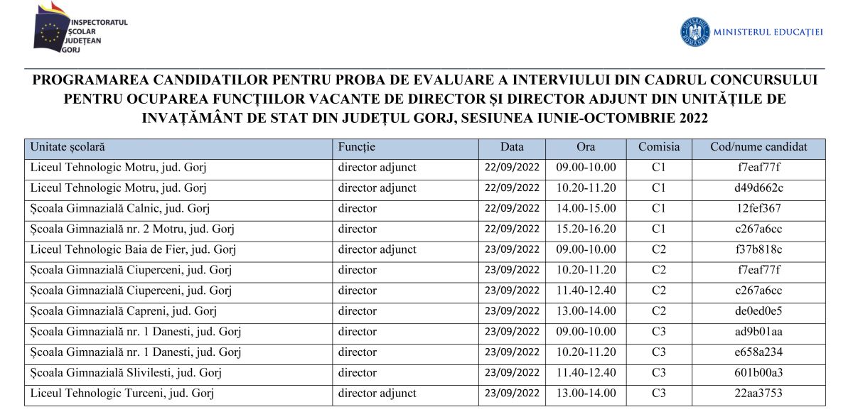 Ei vor susține interviul joi și vineri. „Accesul în centrul și sala de interviu (Liceul Tehnologic Nr. 2 Târgu-Jiu) se va face pe baza documentului de identitate, cu respectarea întocmai a graficului, respectiv, în ziua și ora programate pentru interviu. Accesul candidaților în incinta centrului de examen se face cel mult cu o jumătate de oră înaintea orei planificate”, a comunicat Inspectoratul Școlar Județean Gorj.