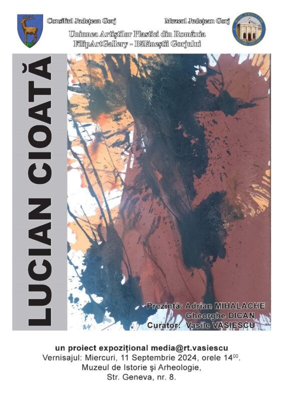 Eveniment cultural, la început de toamnă! Astăzi, 11 septembrie a.c., la ora 14,oo, în sălile Muzeului Județean Gorj, str. Geneva nr. 8 din Târgu Jiu, va avea loc vernisajul expoziției pictorului LUCIAN CIOATĂ – „Expresionism netașist în acuarelă” – un proiect medi@rt.vasiescu, susținut de FilipArtGallery & Muzeul țăranesc cu Artă Contemporană – Bălăneștii Gorjului.