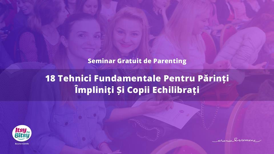 ,,Vino și tu alături de noi și află 18 Tehnici Fundamentale de Parenting și răspunsuri pentru cele mai frecvente probleme ale părinților – de la problema comparațiilor cu alți copii și alți părinți, la problema jucăriilor nestrânse, îmbrăcatului de unul singur și până la problema ,,Mami, m-a părăsit Răzvan”.