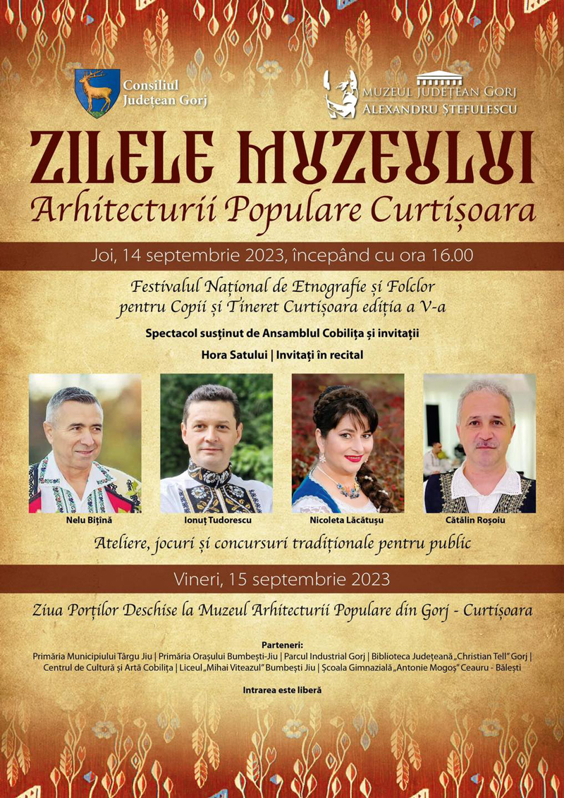 Zilele Muzeului Arhitecturii Populare Curtișoara sunt organizate de Consiliul Județean Gorj, prin Muzeul Județean Gorj „Alexandru Ștefulescu”. Programul de joi al evenimentului este următorul: de la ora 16.00 – Festivalul Național de Etnografie și Folclor pentru Copii și Tineret Curtișoara ediția a V-a – Spectacol susținut de Ansamblul Cobilița și invitații; Hora Satului/Invitați în recital: Nelu Bițînă, Ionuț Tudorescu, Nicoleta Lăcătușu, Cătălin Roșoiu; Ateliere pentru public susținute de meșteri populari și artiști: țesut, cusut, tors, olărit, modelaj, mărgelit, încrustat în lemn, iconărit, artă fotografică (doritorii se pot înscrie până miercuri, 13 septembrie 2023, prin mesaj whatsapp, la tel.: 0766.314.582 – participarea este gratuită); jocuri și concursuri tradiționale. De asemenea, vineri, 15 septembrie 2023, la Muzeul Arhitecturii Populare din Gorj – Curtișoara va avea loc evenimentul Ziua Porților Deschise, ce va presupune un circuit de vizitare a obiectivelor de arhitectură tradițională și tehnică populară. În ambele zile, pentru toate manifestările, intrarea doritorilor este liberă! Partenerii evenimentului sunt: Primăria Municipiului Târgu Jiu, Primăria Orașului Bumbești-Jiu, Parcul Industrial Gorj, Biblioteca Județeană „Christian Tell” Gorj, Centrul de Cultură și Artă Cobilița, Liceul „Mihai Viteazul” Bumbești Jiu, Școala Gimnazială „Antonie Mogoș” Ceauru – Bălești.