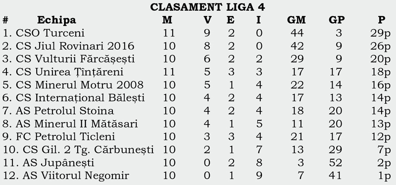 Etapă tumultuoasă în eșaloanele patru și cinci din Gorj. S-au marcat multe goluri pe stadioanele din județ, dar a fost rost și de scandal. La Văgiulești, meciul dintre AS Foresta și AS Viitorul Plopșoru s-a terminat cu o bătaie generală. Arbitrii au suspendat partida după ce mai mulți jucători s-au luat la pumni, iar pe teren au intrat și spectatorii. Rezultatul va fi stabilit de Comisia de Disciplină. Revenind la fotbal, au fost 11 goluri la Țicleni, unde gazdele nu au avut milă de AS Jupânești. De asemenea, liderul CSO Turceni a marcat de șapte ori în victoria cu Unirea Țînțăreni. În Seria 2 din Liga 5 au fost partide cu 10 și 11 goluri. O altă premieră a acestui sezon a fost înfrângerea Științei Godinești, liderul Seriei 1, care a cedat la un scor surprinzător pe terenul formației de la Dragotești.